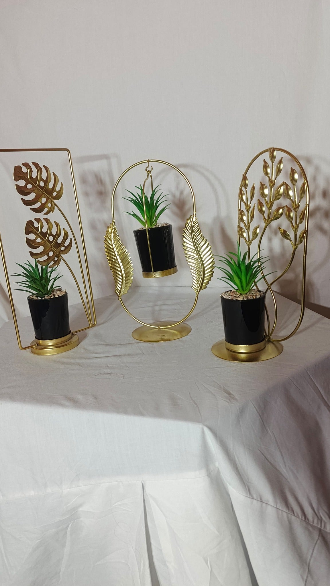 Introduce a touch of glamorous, modern greenery to your interiors with this exquisite Set of 3 Gold and Black Planters. This collection features three unique gold-finished metal stands, each showcasing a distinct, stylish leaf design: